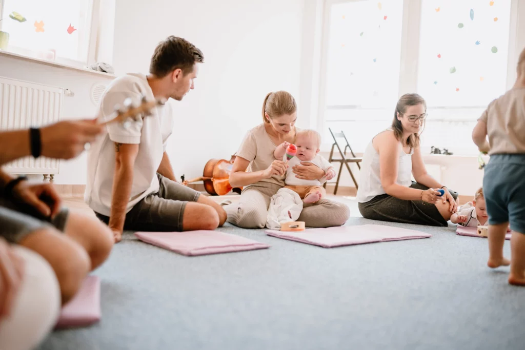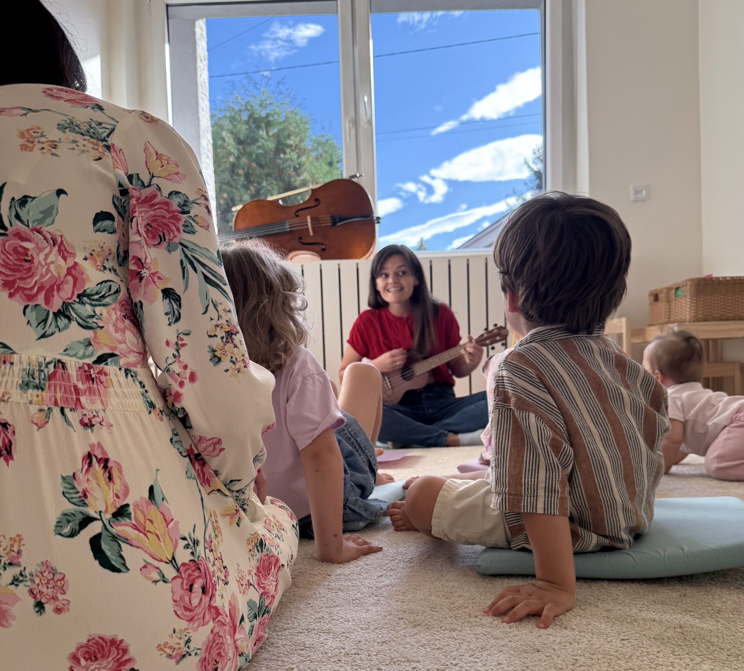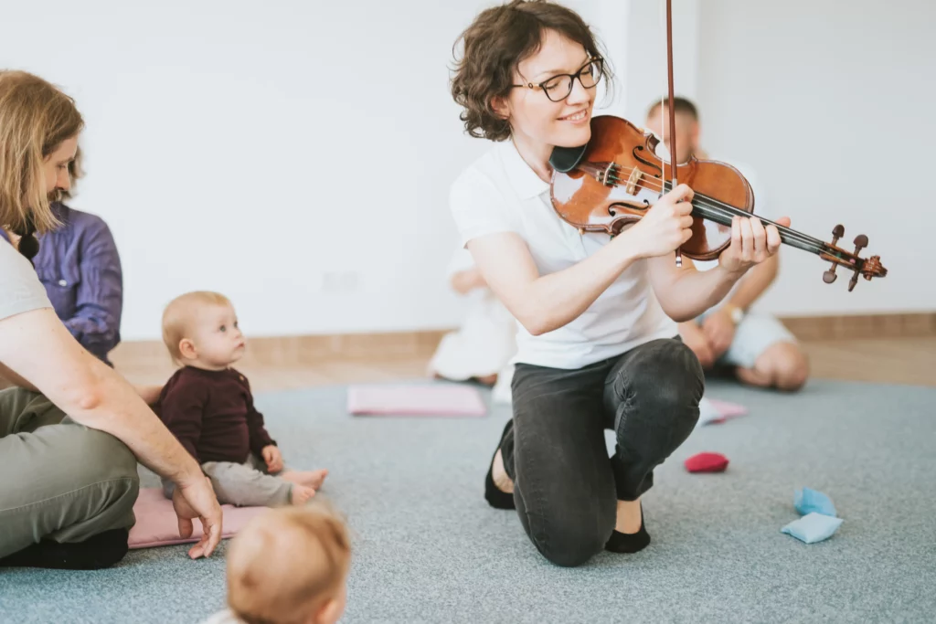Twoje dziecko poznaje różne instrumenty i słucha muzyki na żywo, zamiast puszczanej z głośników. Poprzez zabawy melodią, rytmem, powtarzaniem i improwizacją uczy się języka muzycznego i staje się umuzykalnione.